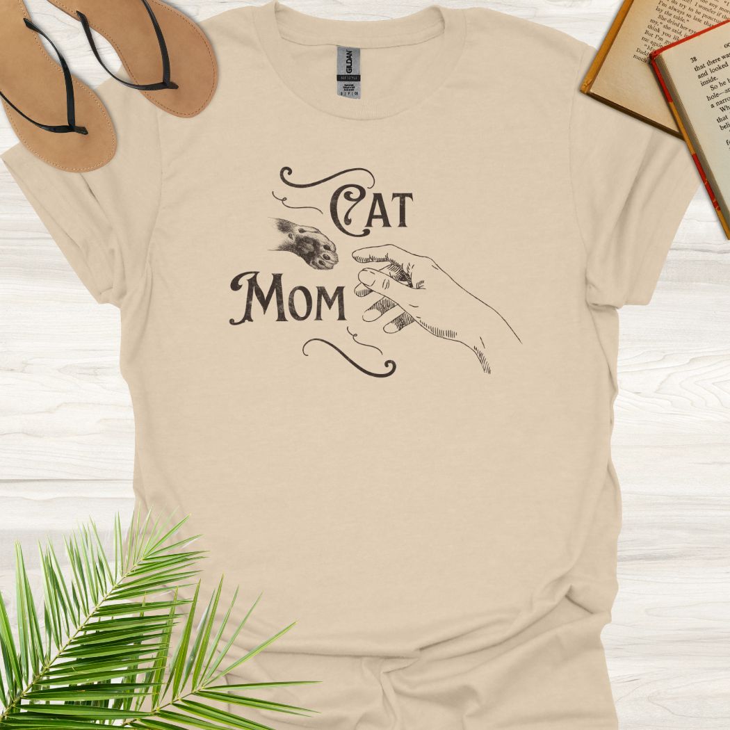 Cat mom t-shirt, funny cat lover tee, cat paw hand touch, pet humor shirt, Michelangelo parody, creation of Adam cat style, feline mother shirt, cat owner gift, artistic cat tee, paw and hand graphic, cat themed humor, pet mom apparel, minimalist cat design, classical art parody, cat appreciation shirt, kitty mom shirt, clever cat joke tee, modern cat art shirt, animal lover humor, cat and human bonding, perfect gift shirt, cat mom pride, cat mom joke shirt, artistic pet design, cat lovers gift idea, cat-human connection, cute cat quote shirt, quirky cat owner tee